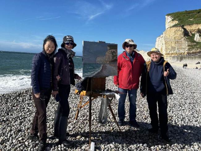 1883年,莫内在 Etretat 停留并画了一组画,对【一日不同时间及不同季节】的光线的研究。5月中,复兴协会的朋友前往“象鼻山”停留两天进行【写生】